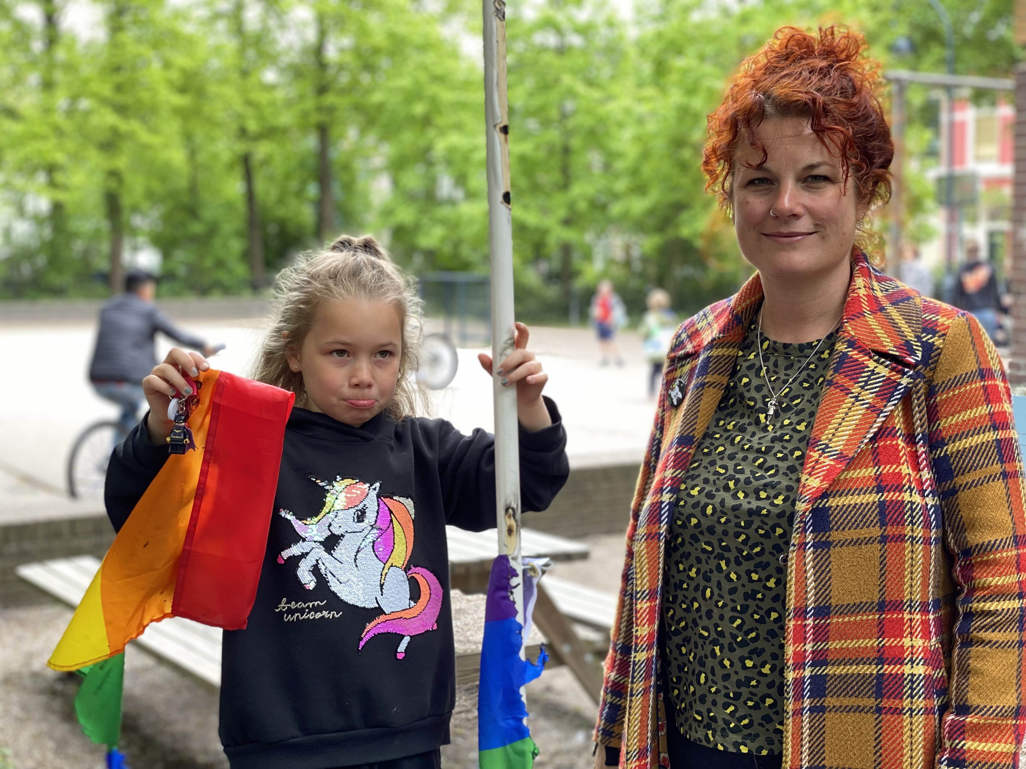 De zevenjarige Pippi Baumgarten was vanochtend een van de eersten die de resten van de verbrande vlag zag: ‘’Ik kwam op school en was eerder dan mijn moeder. Toen zag ik dat de regenboogvlag weg was en ik zag een groepje kinderen om de verbande resten heen staan. Ik ben toen best wel geschrokken.”