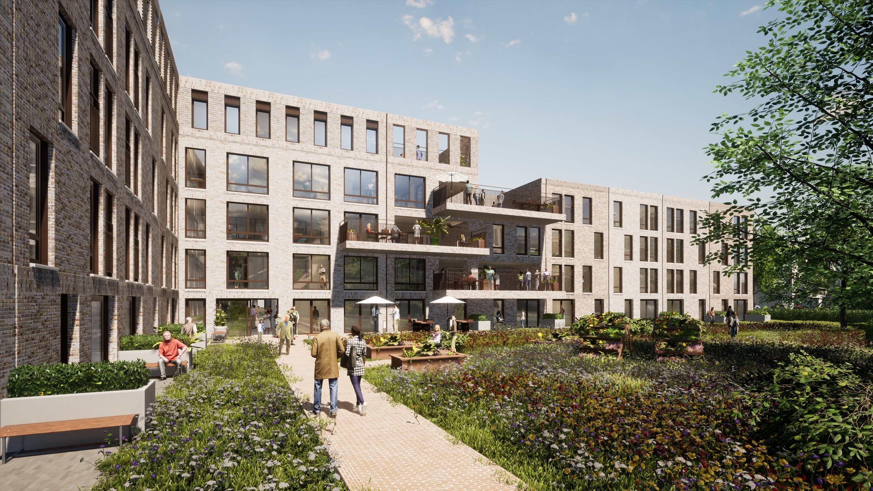 De bouw van het tweede deel van Hof van Jacob, met zelfstandige zorgwoningen, is inmiddels gestart en wordt de komende jaren in fasen afgerond. Zie hieronder een impressie van de binnentuin en vanaf de Amerikavaart.