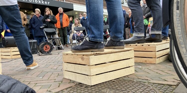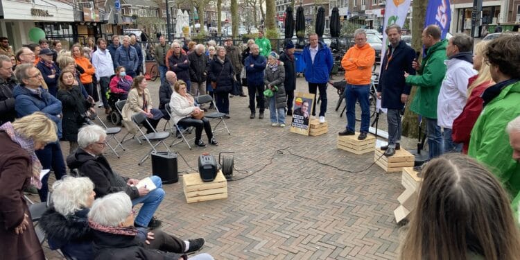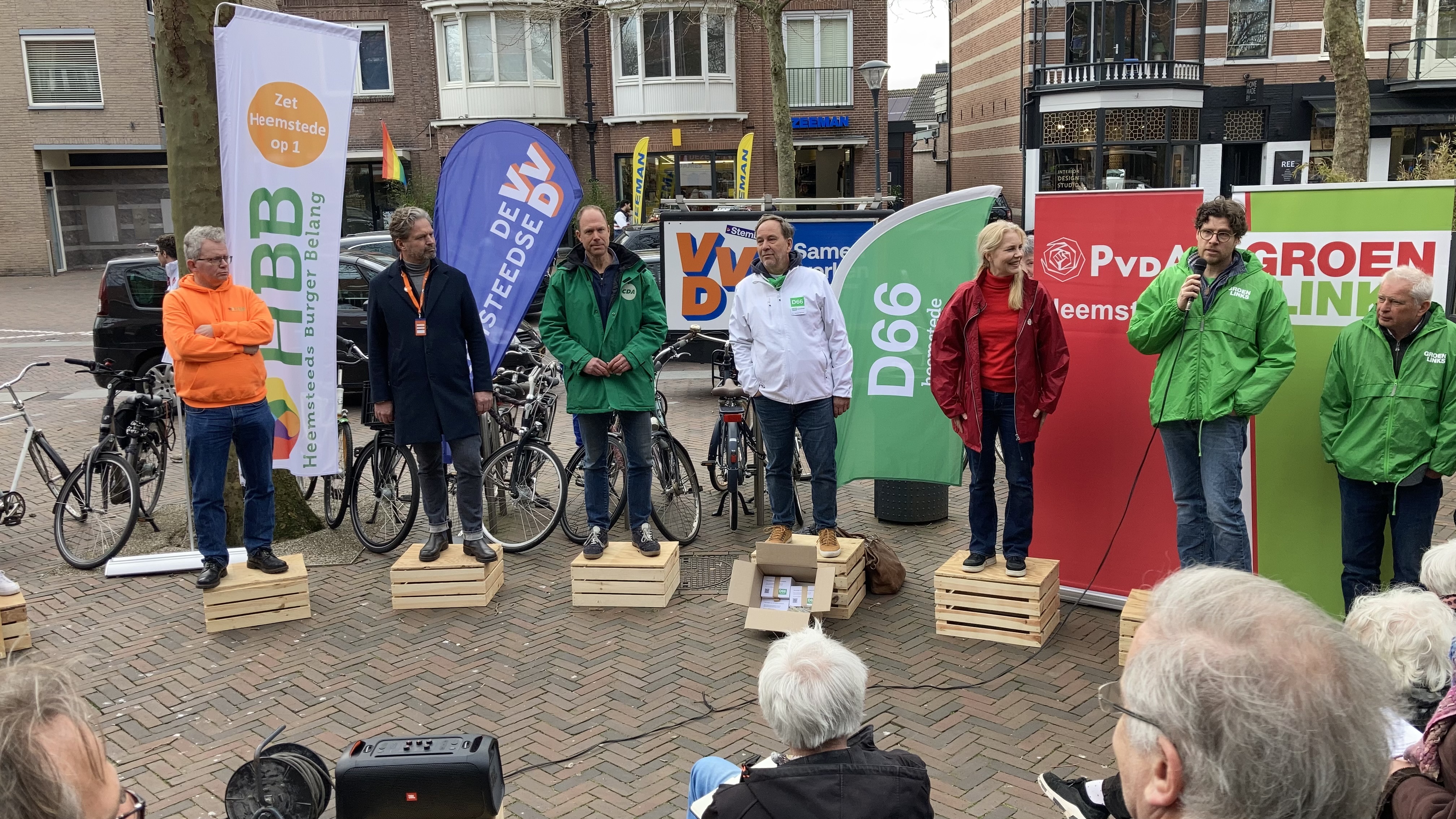 Om 15.00 uur is het zover. De zeven partijen presenteren zich op hun kistjes. Ze hebben hun clubkleuren allemaal aangetrokken, inmiddels staan er zo’n zestig geïnteresseerden te wachten op wat komen gaat. De partijen krijgen allemaal dertig seconden om zich voor te stellen en hun belangrijkste speerpunten te vertellen voor de komende vier jaar. Woningbouw, participatie, de zorg en 30 km/uur-zones bijvoorbeeld. En dan is het de beurt aan het publiek om vragen te stellen.