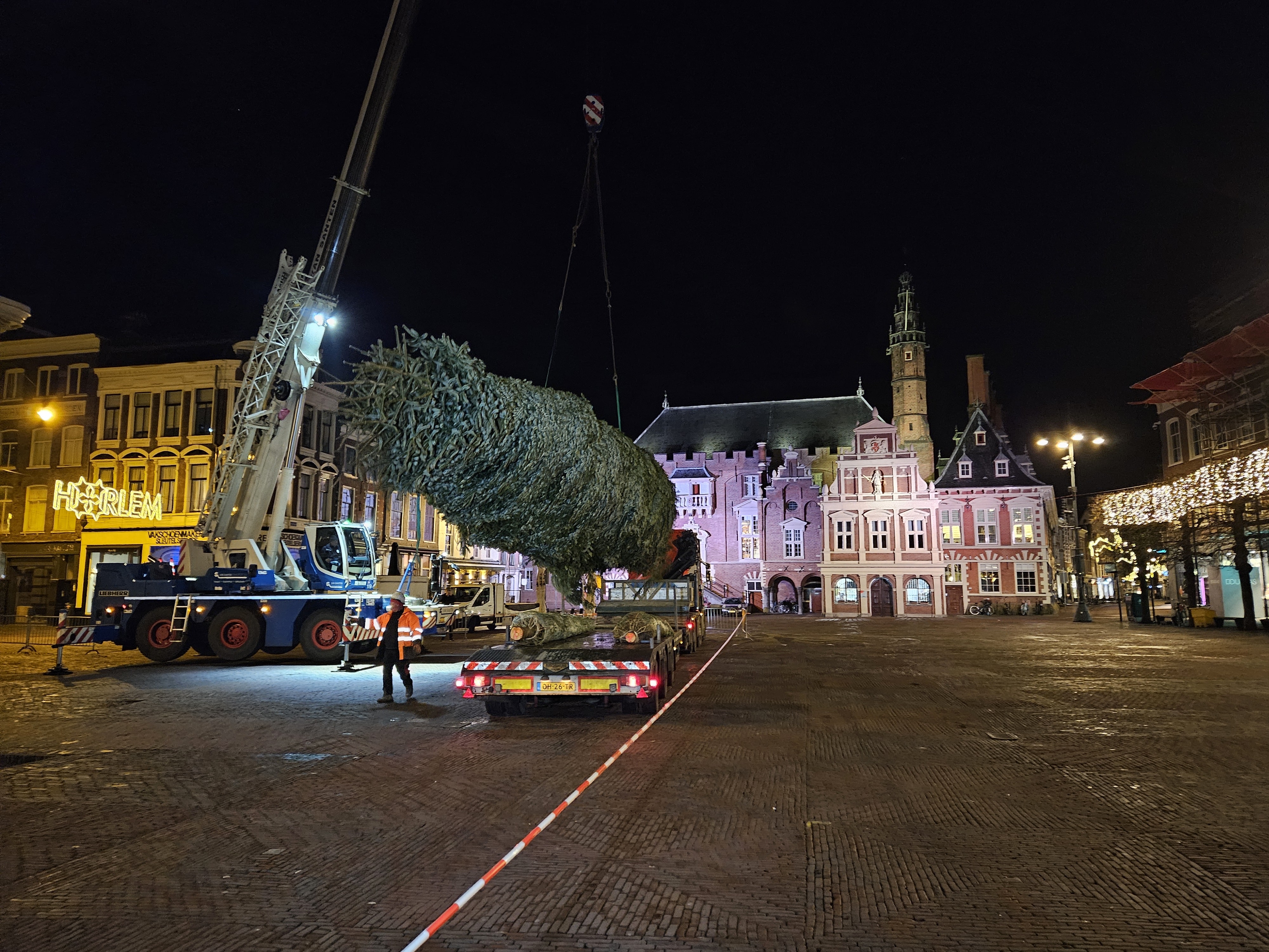 Hij is 17 meter lang, weegt meer dan twee en halve ton, er hangen ongeveer tienduizend lampjes in en staat sinds vanochtend vroeg weer op de Grote Markt in Haarlem: de kerstboom. Even voor 06:00 uur vanochtend reed een vrachtwagen met de boom Haarlem in, live te zien op Haarlem105 tv. Vervolgens duurde het nog tot 09:00 uur tot de boom goed en stevig stond. “Het is weliswaar een routine klus, maar wel altijd een mooi moment”, zegt Onno Beukenhorst van Spaarnelanden.