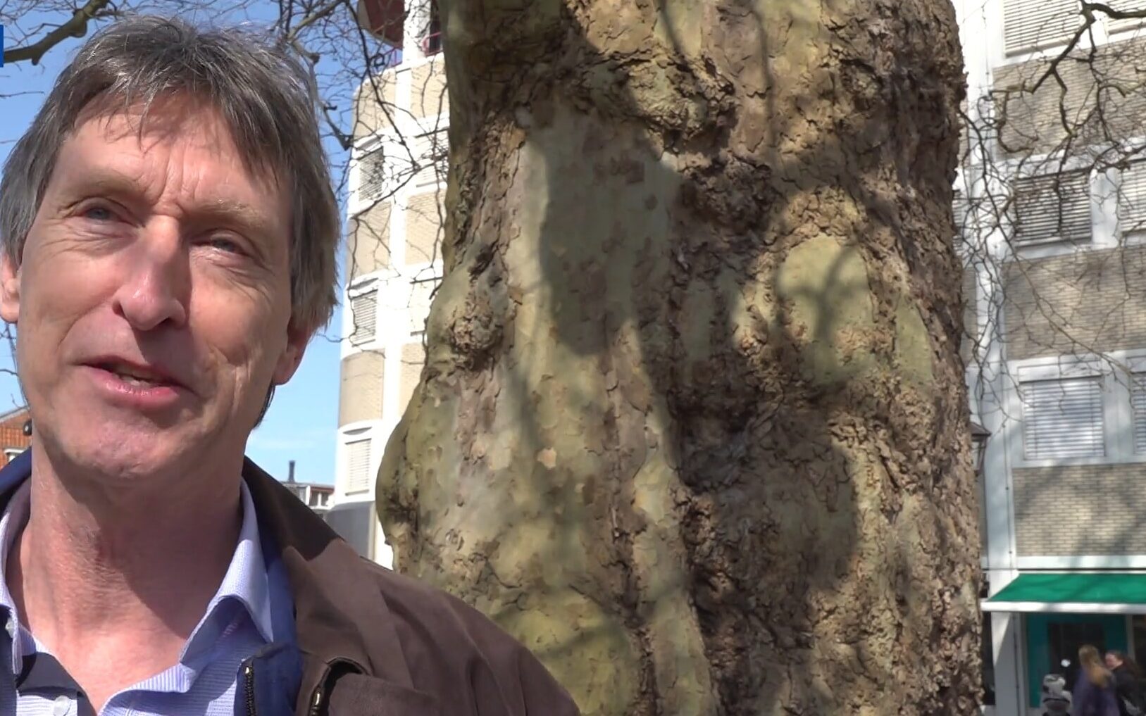 We spreken Harry bij een van de oudste bomen in Haarlem, de plataan op het Houtplein die meer dan honderd jaar oud is. Die loopt voorlopig geen gevaar, in tegenstelling tot de rij van bomen voor de winkels op de stoep van het Houtplein.