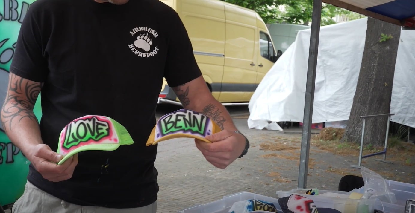 Op de markt van Bevrijdingspop, naast het provinciehuis, kun je niet alleen eten en kleding scoren, maar ook een gepersonaliseerde pet laten maken door airbrushkunstenaar Mark Berenboot. Mark vertelt hoe hij ooit begon met tekenen, zichzelf de techniek aanleerde via YouTube, en nu live op het festival custom petjes spuit voor jong en oud.