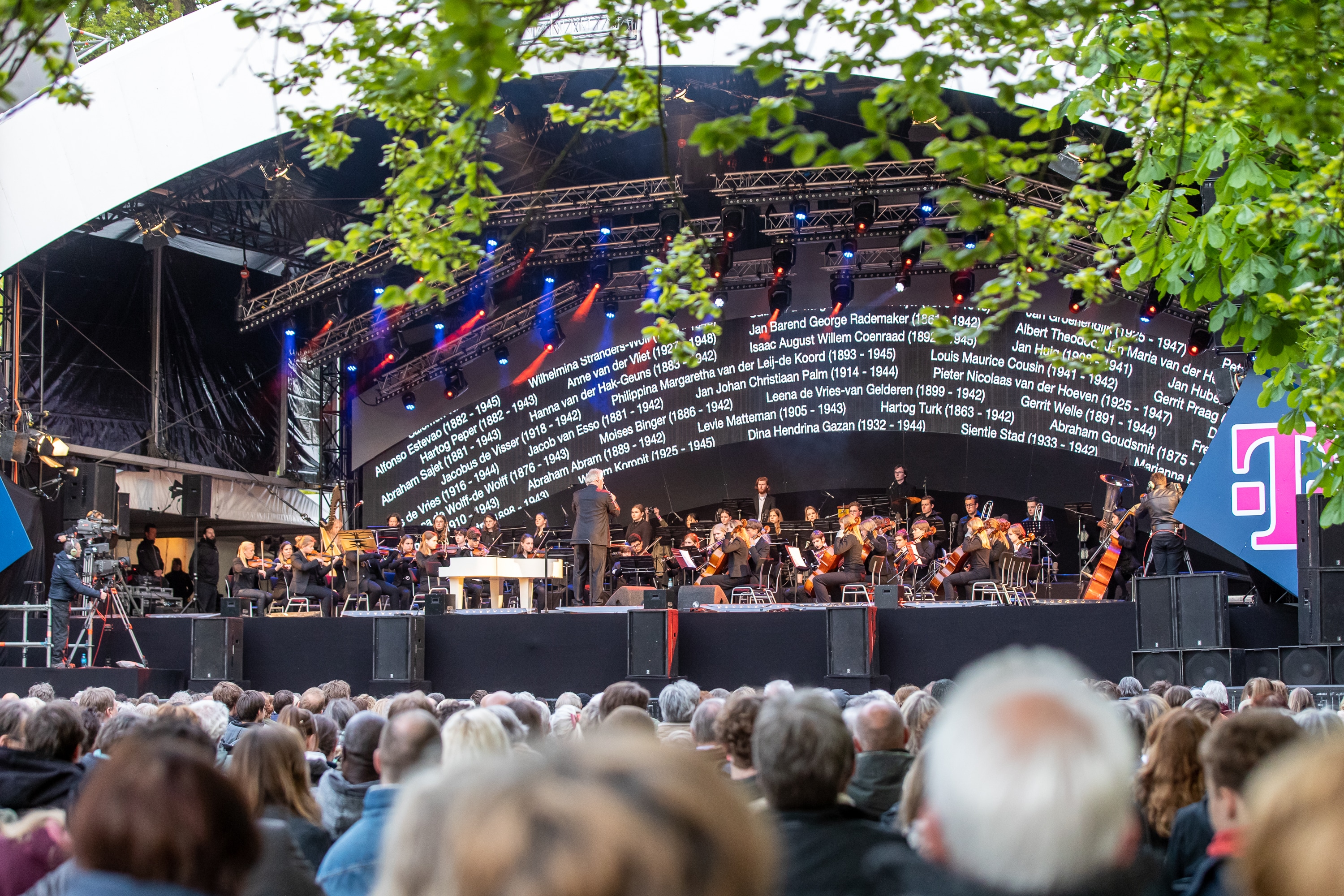 Het Kennemer Jeugd Orkest onder leiding van Matthijs Broers trad op het (digitale) Herdenkingsconcert van 2021 al eens op met Rilan & The Bombardiers. Dit jaar deden ze dit nog eens dunnetjes over, dit keer op het podium in de Haarlemmerhout, inclusief publiek. Een Oekraïens nummer Elegy voor harp en strijkers van Alla Pavlova legt ook muzikaal de link met de huidige oorlog.