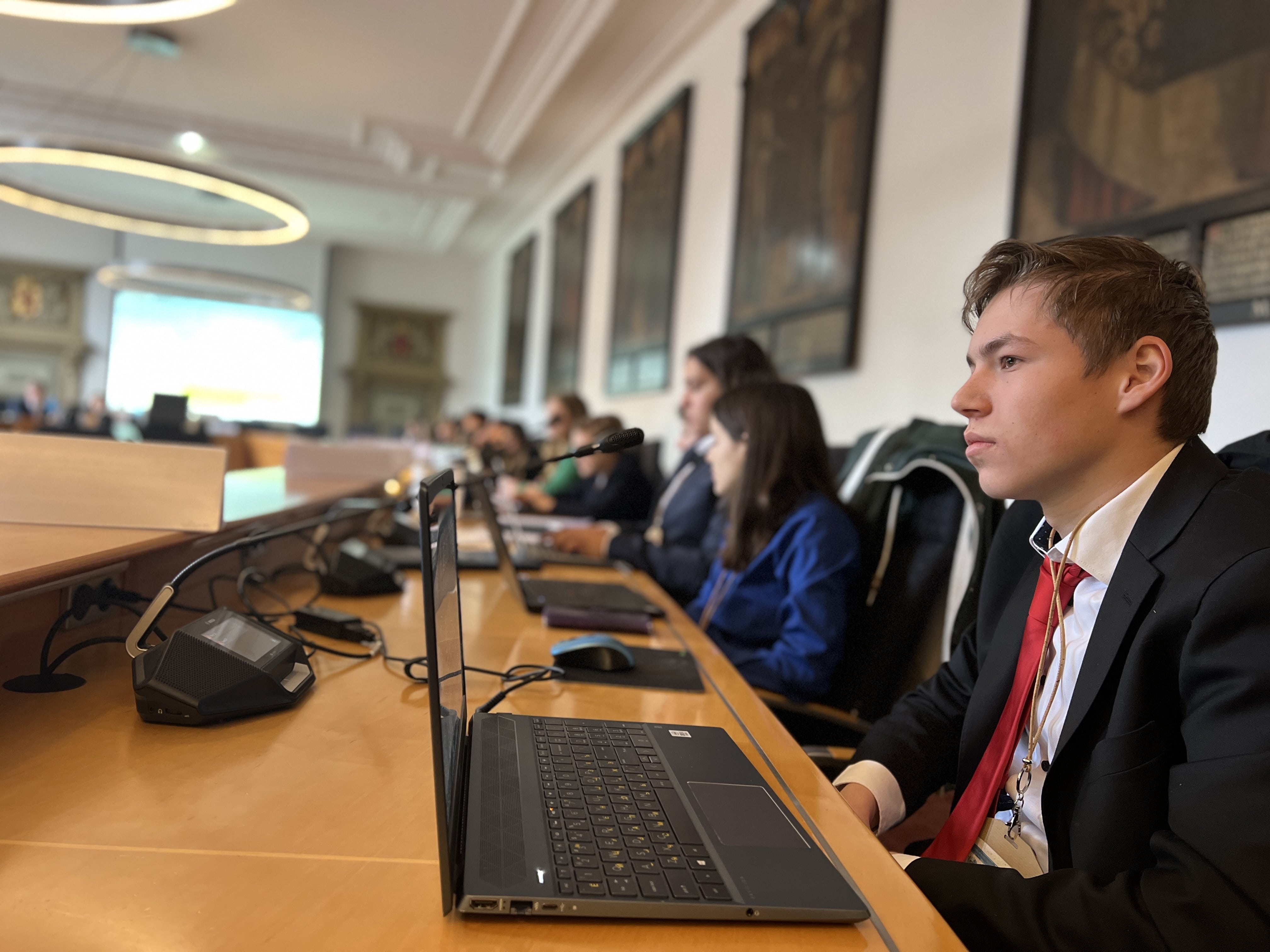 In de raadszaal van het gemeentehuis zitten twee scholieren achter een bordje met daarop het land dat ze vertegenwoordigen. “Ieder land wordt gerepresenteerd door een leerling”, vertelt Julian van Halteren, voorzitter van de vergadering. “Ze praten dus allemaal vanuit hun eigen policy [beleid, red.] en hoe dat land naar de kwestie aankijkt.”