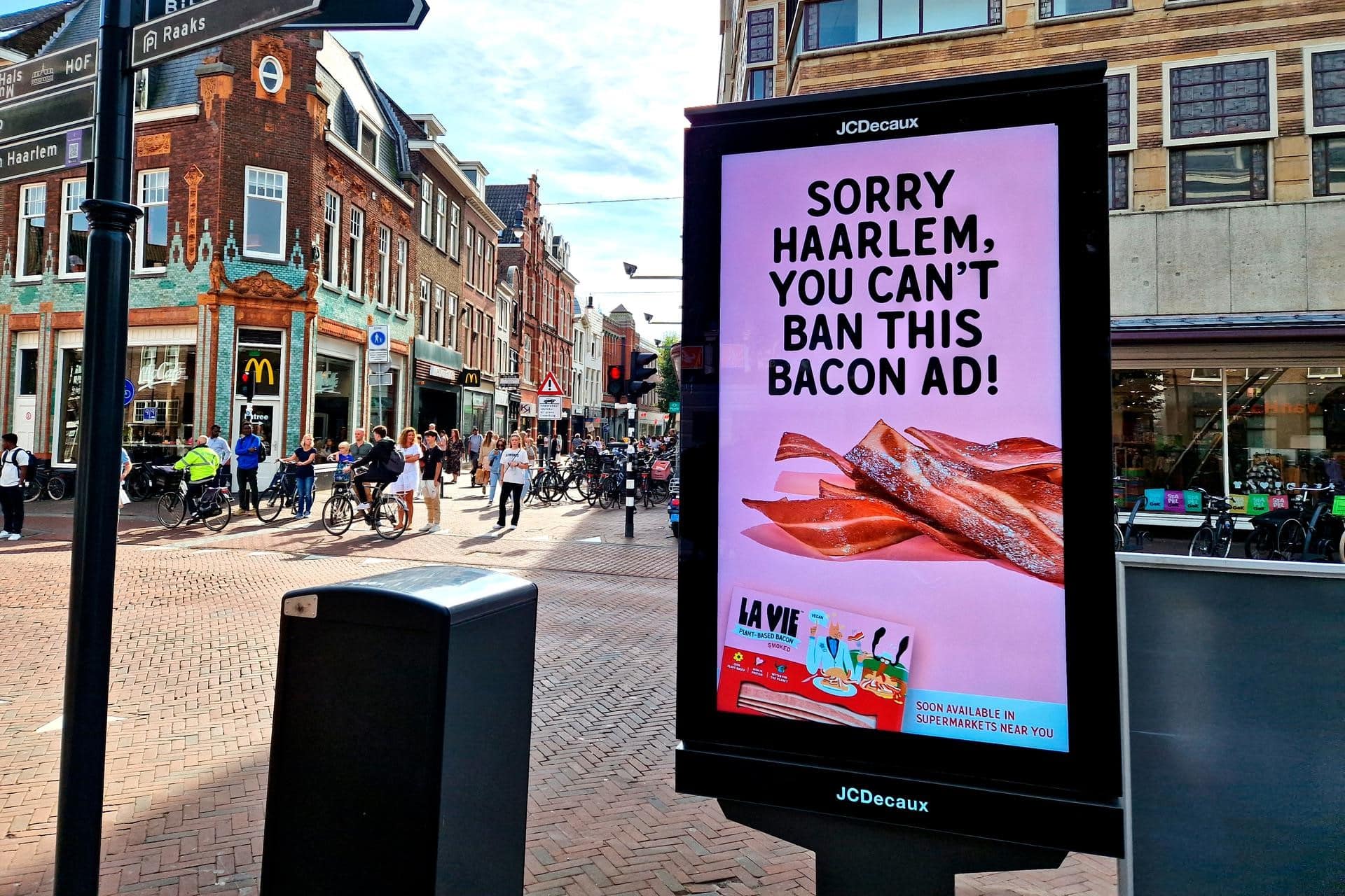 Na de aankondiging dat Haarlem een verbod op (bio-industrie) vleesreclame in zal voeren is er een politieke storm losgebarsten in de Spaarnestad. De Franse start-up La Vie maakt handig gebruik van het moment en lanceert een slimme postercampagne met als tekst: ‘Sorry Haarlem, je kunt deze advertentie niet verbieden’. In de hele stad zijn posters opgehangen waarop hun plantaardige vleesproducten zijn afgebeeld. Daarmee willen ze duidelijk maken dat zíj́ het besluit van de gemeente steunen. Opgetogen laat de start-up weten dat reclame voor hun producten niet onder het verbod valt.