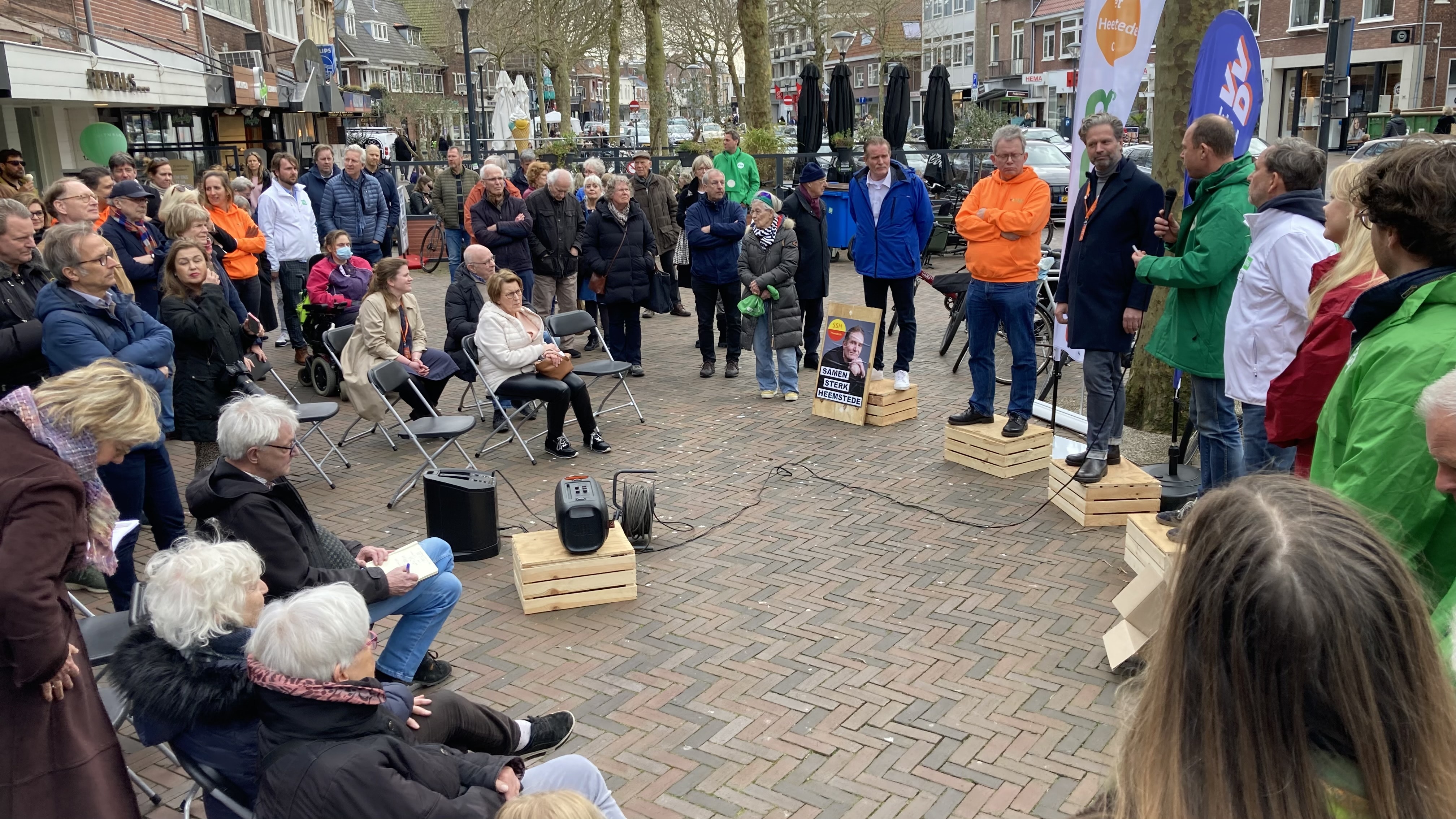 Om 15.00 uur is het zover. De zeven partijen presenteren zich op hun kistjes. Ze hebben hun clubkleuren allemaal aangetrokken, inmiddels staan er zo’n zestig geïnteresseerden te wachten op wat komen gaat. De partijen krijgen allemaal dertig seconden om zich voor te stellen en hun belangrijkste speerpunten te vertellen voor de komende vier jaar. Woningbouw, participatie, de zorg en 30 km/uur-zones bijvoorbeeld. En dan is het de beurt aan het publiek om vragen te stellen.